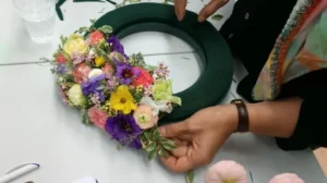Frühlingsblüherpflanzen, Schnittblumen, Grün, Styropor, Strohreifen, Moos, Draht usw.